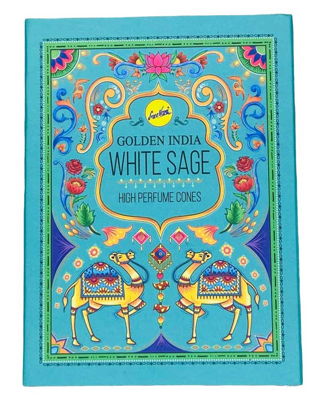 Golden India White Sage high backflow cones. Beautifully packaged box containing 10 premier quality high perfume cones. From India and free from chemicals and toxic agents.12 individual boxes per case.